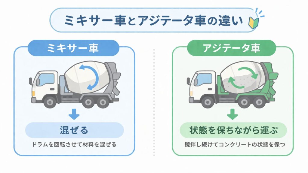 【図解】ミキサー車とアジテータ車の違いをやさしく解説|現場での役割と見分け方の考え方