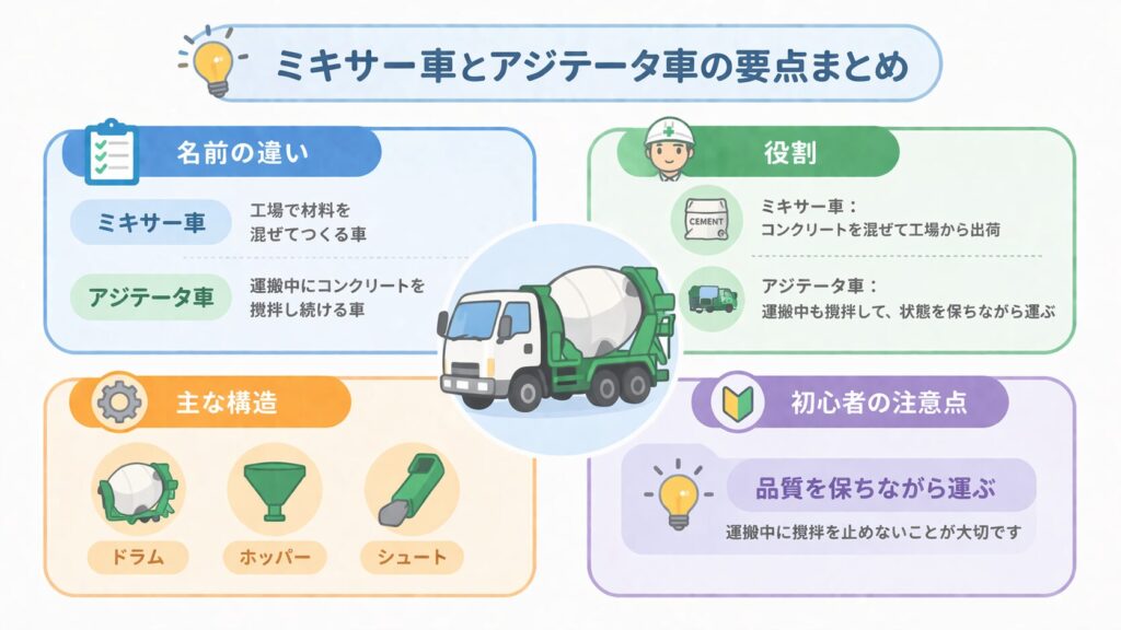 この記事では、ミキサー車とアジテータ車の違いを、初めて学ぶ人にもわかるように整理します。