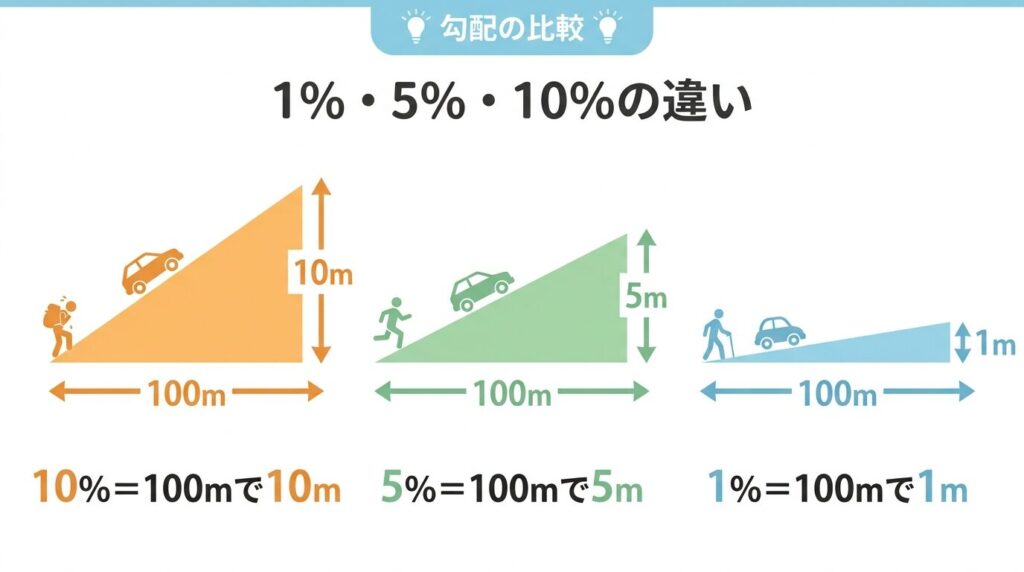 数値が大きくなるほど、坂は急になります。特に10%を超えると、見た目でも「かなり傾いている」と感じやすくなります。