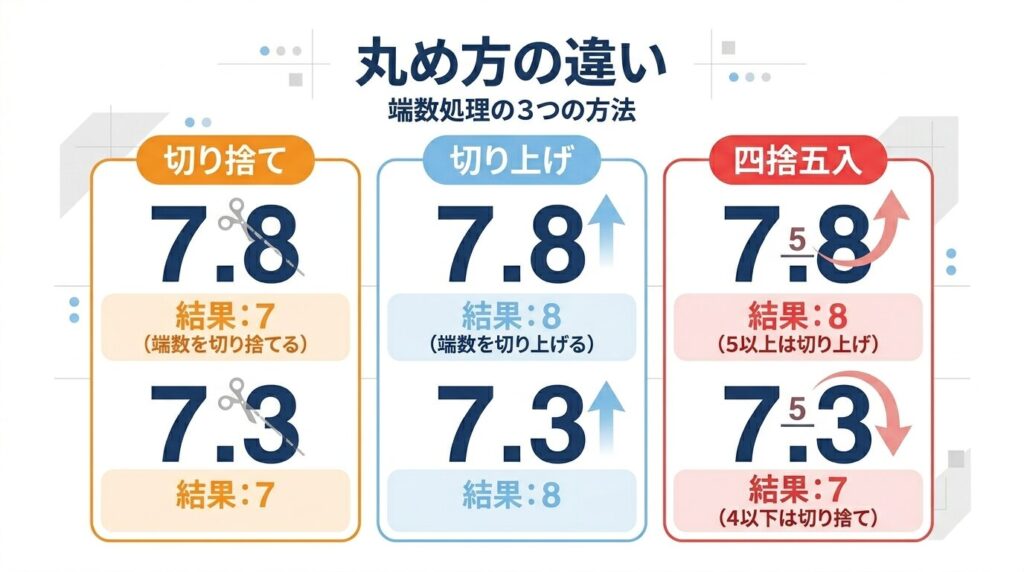 小数を整数にしたり、指定された桁でまとめたりするときには、 切り捨て・切り上げ・四捨五入の3つがよく使われます。