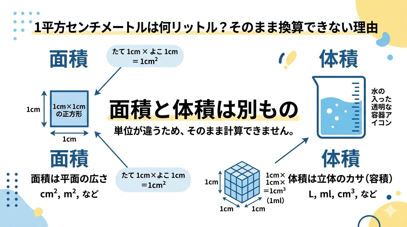 1平方センチメートルは、広さを表す単位です。リットルは、入る量を表す単位です。この2つは見ているものが違うため、そのまま数字を置き換えることはできません。