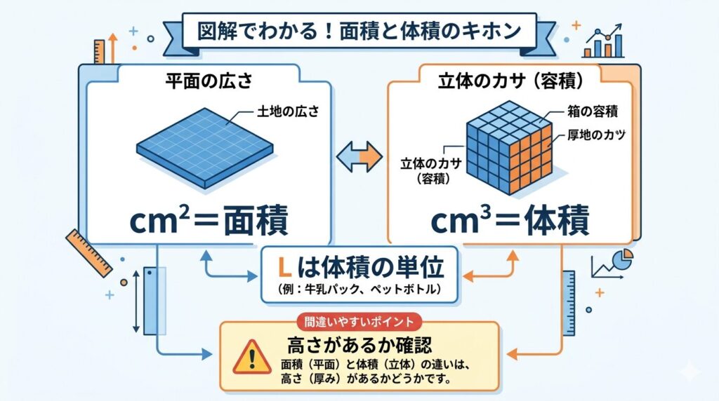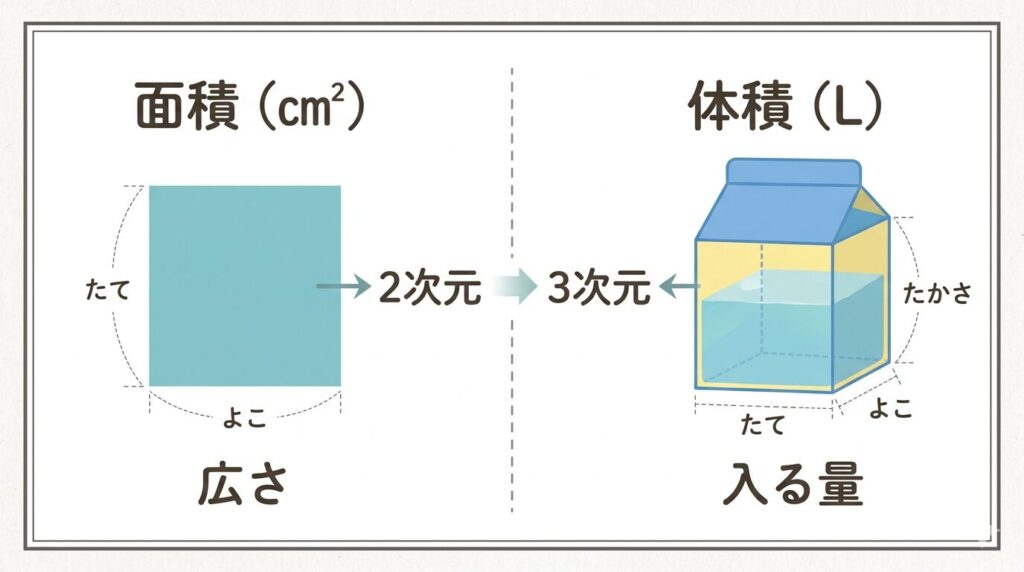 問題文で「面積」と書かれているのに、いきなりリットルへ進もうとすると混乱しやすくなります。そんなときは、高さ・深さ・厚みの情報があるかを先に確認すると判断しやすいです。