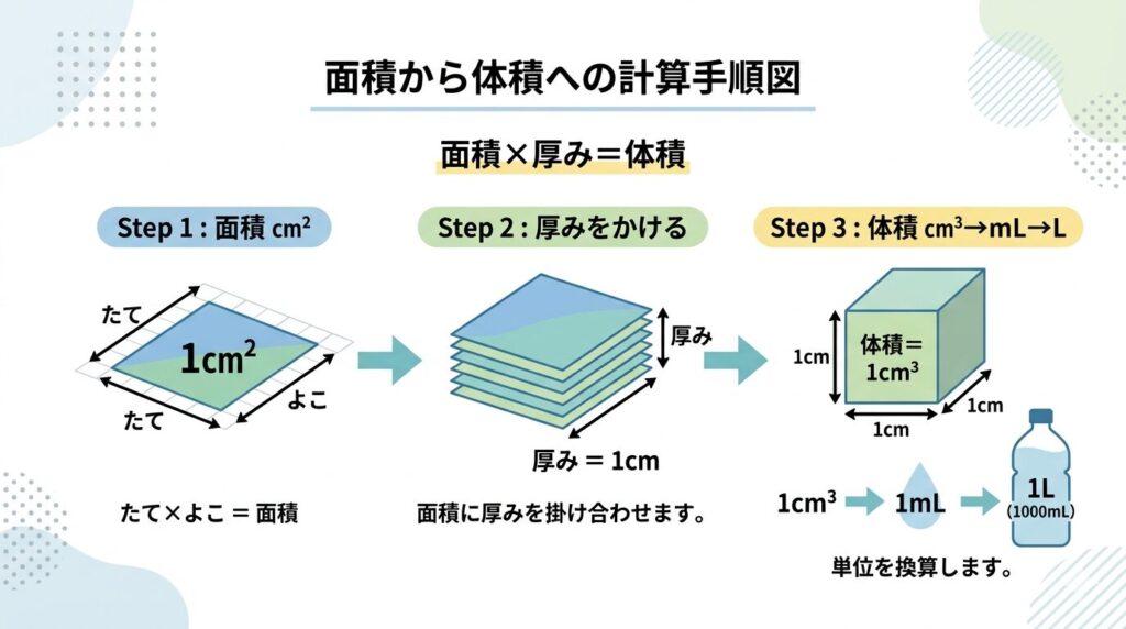 面積 × 厚み = 体積という手順を踏んではじめて、リットルへ進めます。