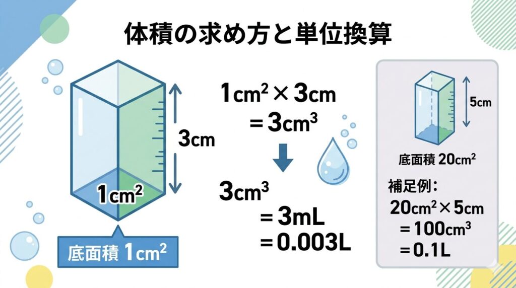 | 1cm²・厚み3cm | 1 × 3 = 3cm³ | 3mL = 0.003L |